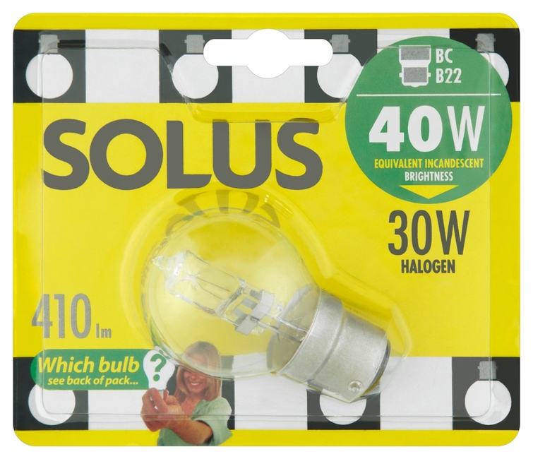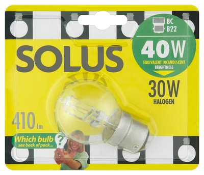 | Description | Solus (40W = 30W) BC Clear Round Halogen E/Sa |